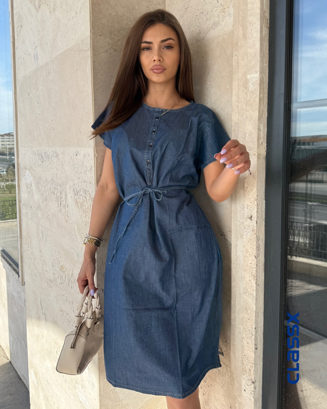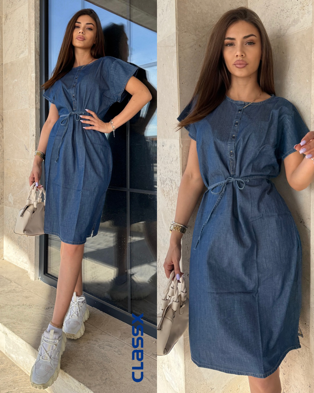 Udobna, praktična i uvek u trendu – ova denim haljina je savršen izbor za svakodnevne i opuštene prilike. Napravljena od laganog teksasa, s kratkim rukavima i kopčanjem na dugmiće, ova haljina kombinuje jednostavnost i stil. Pojas u struku omogućava da je prilagodiš svojoj figuri, dok ravni kroj daje ležernu notu.