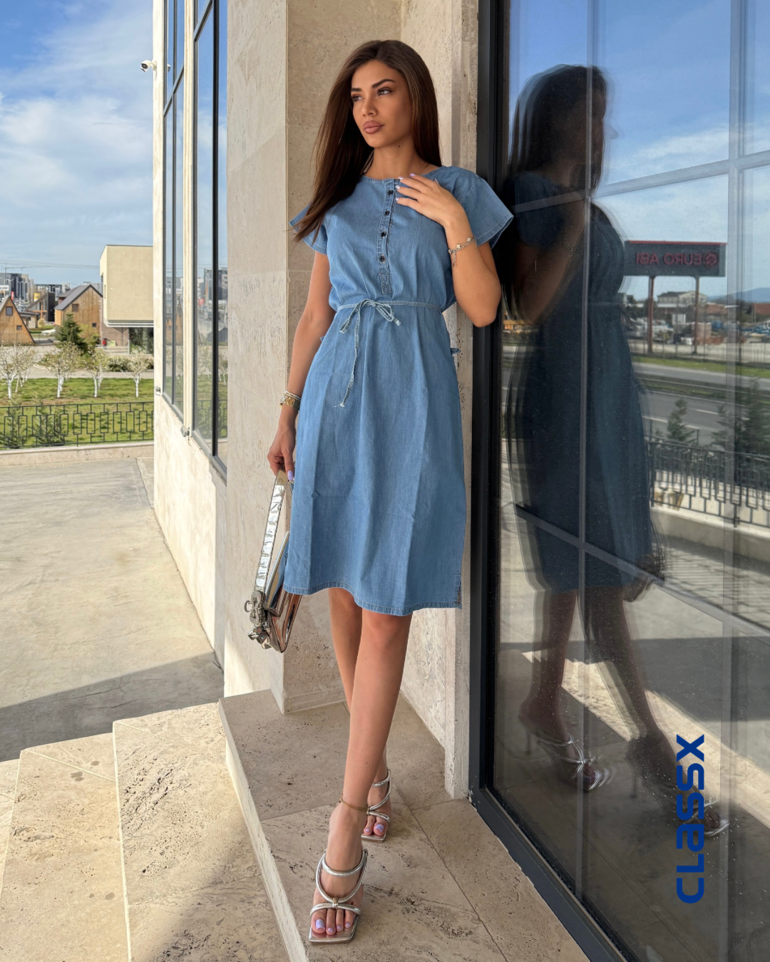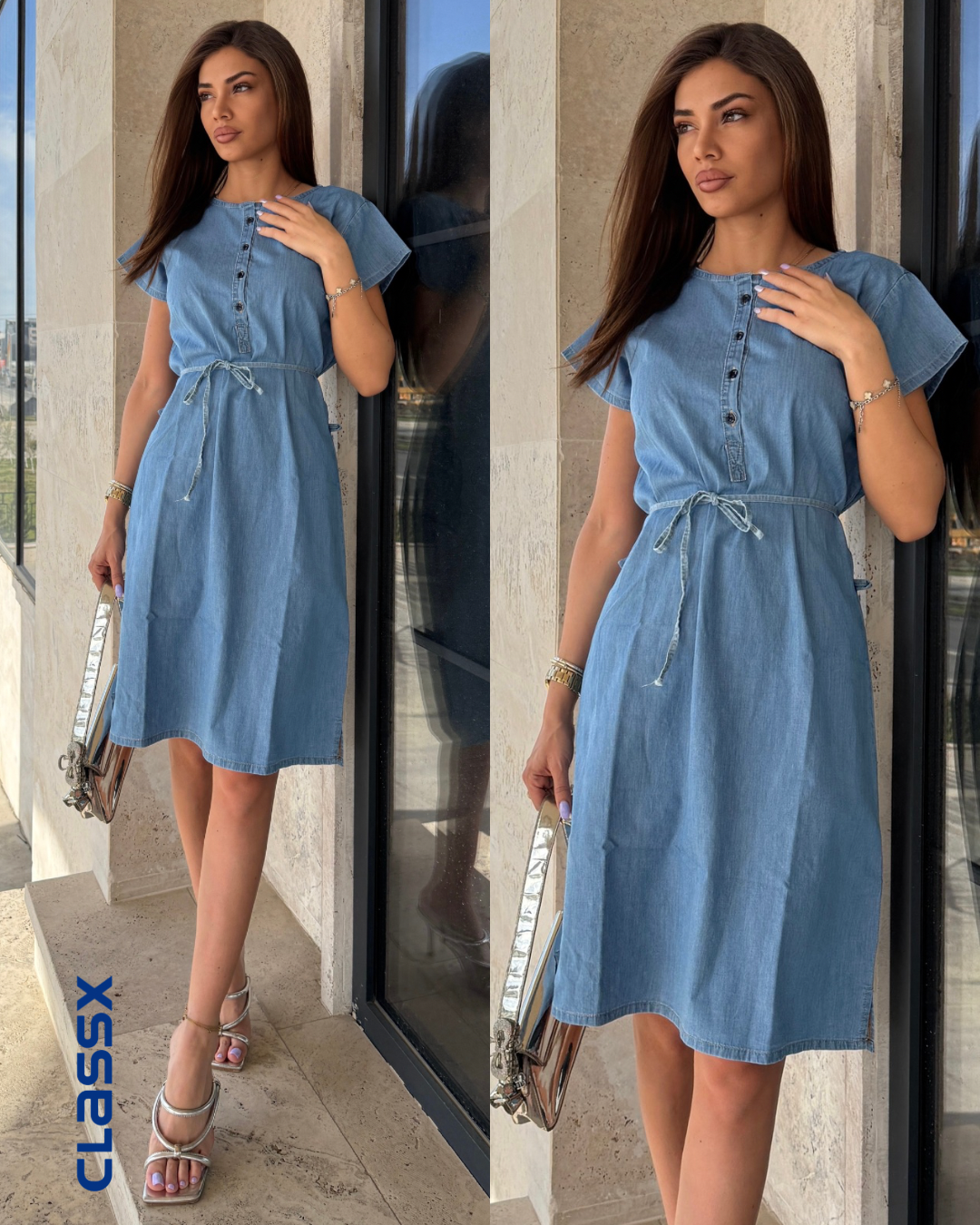 Udobna, praktična i uvek u trendu – ova denim haljina je savršen izbor za svakodnevne i opuštene prilike. Napravljena od laganog teksasa, s kratkim rukavima i kopčanjem na dugmiće, ova haljina kombinuje jednostavnost i stil. Pojas u struku omogućava da je prilagodiš svojoj figuri, dok ravni kroj daje ležernu notu.