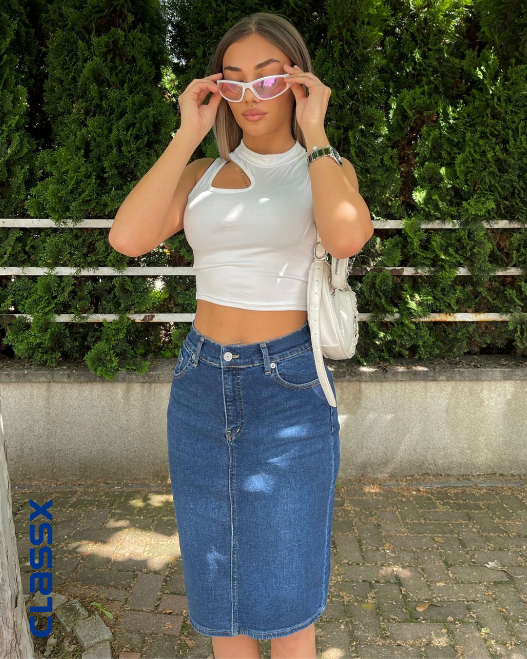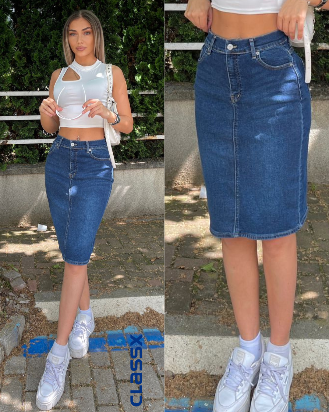 Teksas suknja do kolena je elegantan i trendi komad odeće. Visokog su struka i sadrže dosta elastina čineći je veoma udobnom za nošenje. One se mogu nositi casual uz ležernu majicu ili džemper i patike za opušten izgled ili ih možete kombinovati s bluzom i štiklama za elegantan i sofisticiran izgled. Takođe, veoma svestrane i mogu se nositi tokom svih sezona, zavisno od toga s čim ih kombinujete.
