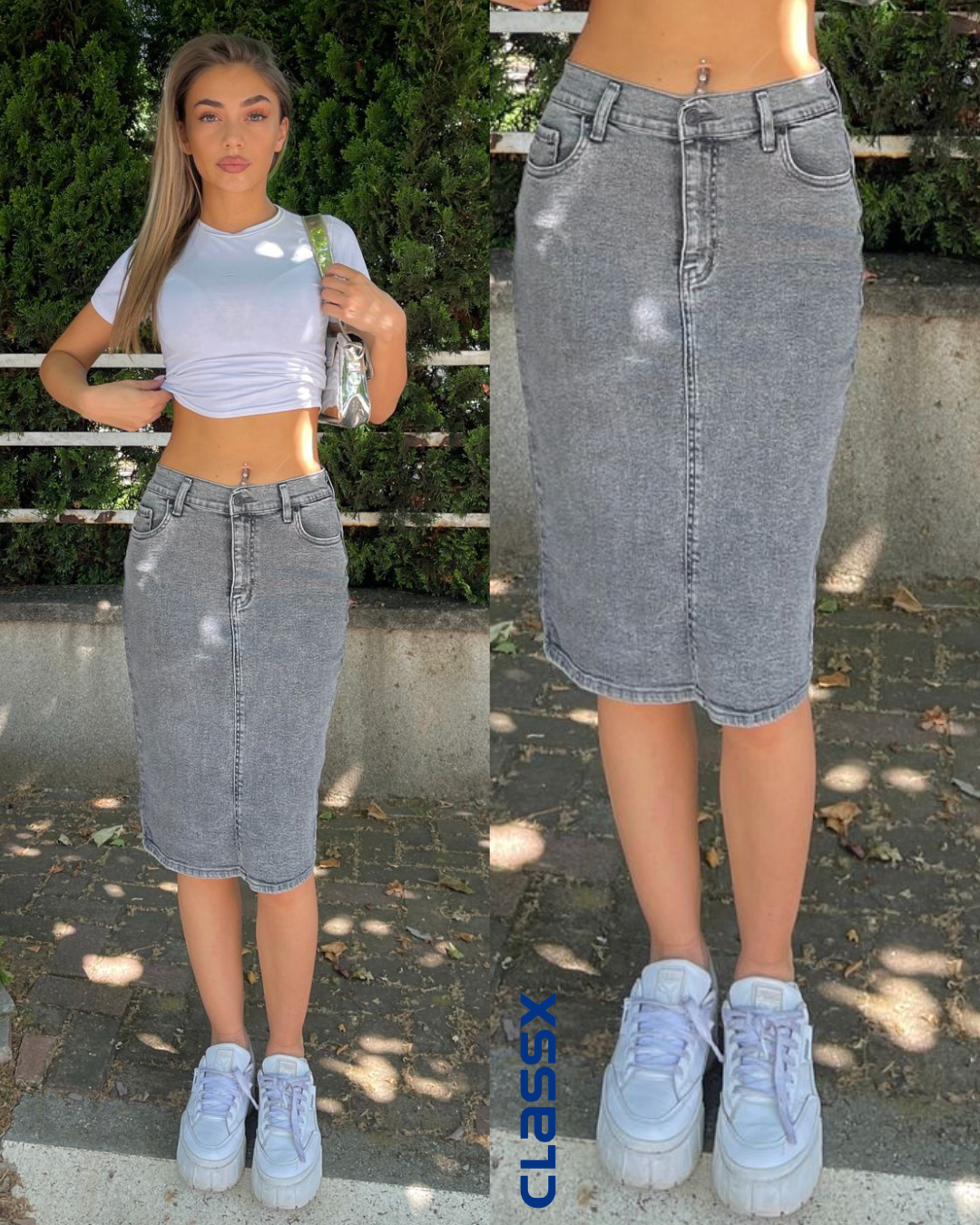 Teksas suknja do kolena je elegantan i trendi komad odeće. Visokog su struka i sadrže dosta elastina čineći je veoma udobnom za nošenje. One se mogu nositi casual uz ležernu majicu ili džemper i patike za opušten izgled ili ih možete kombinovati s bluzom i štiklama za elegantan i sofisticiran izgled. Takođe, veoma svestrane i mogu se nositi tokom svih sezona, zavisno od toga s čim ih kombinujete.