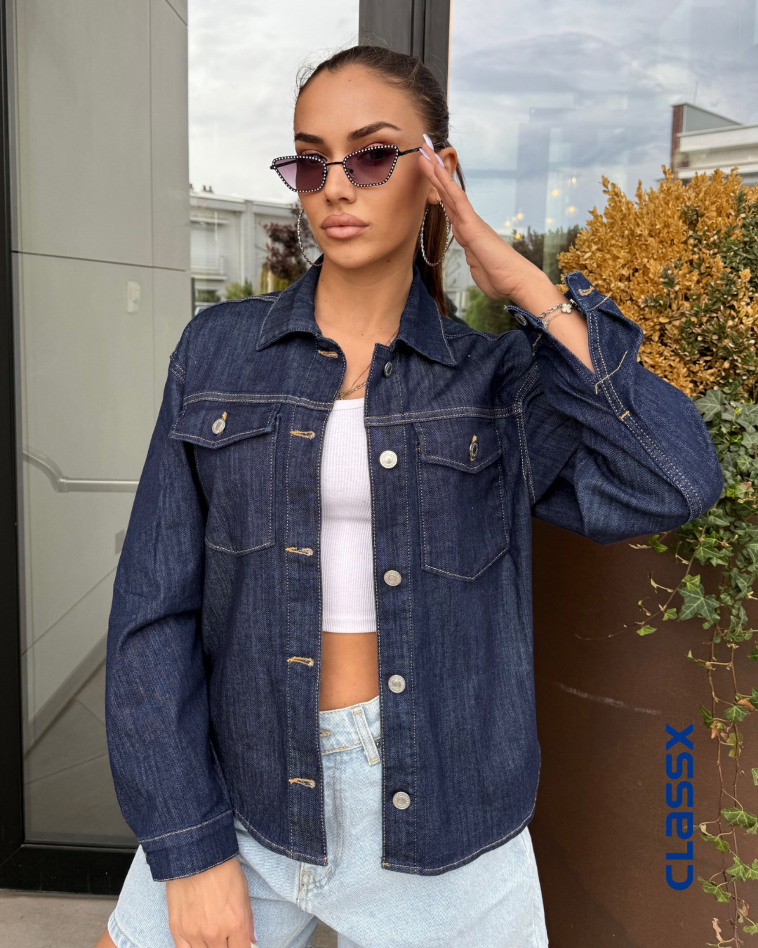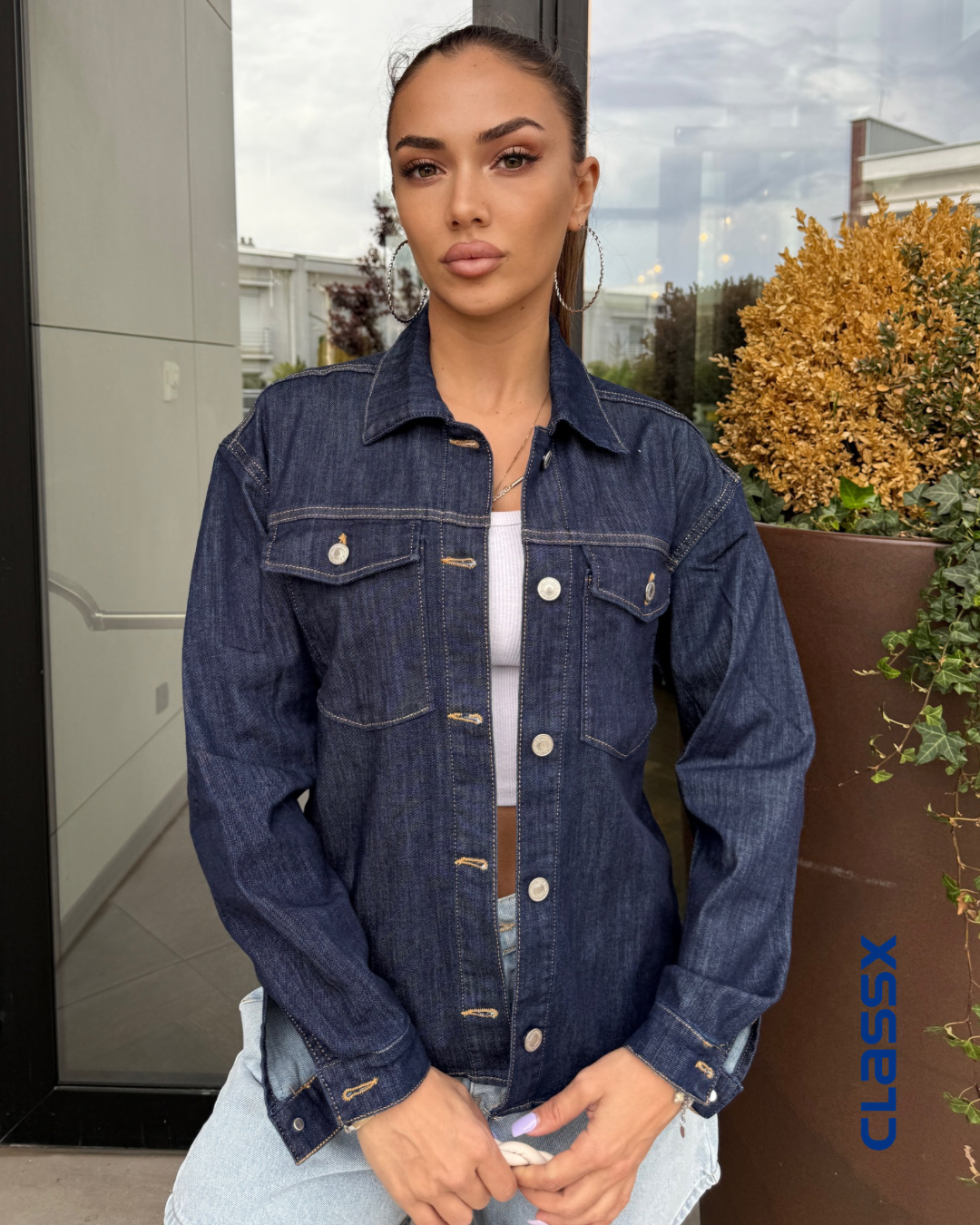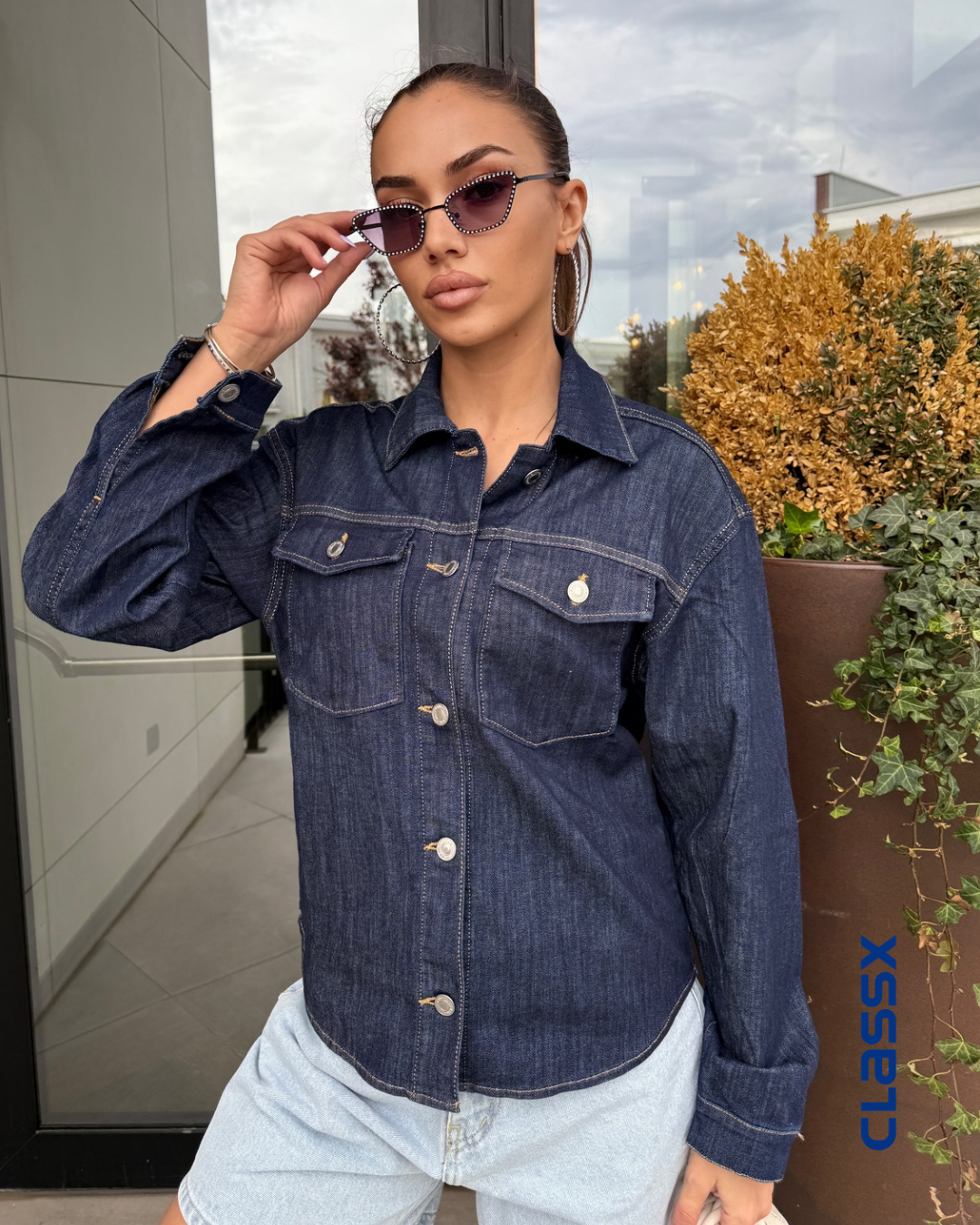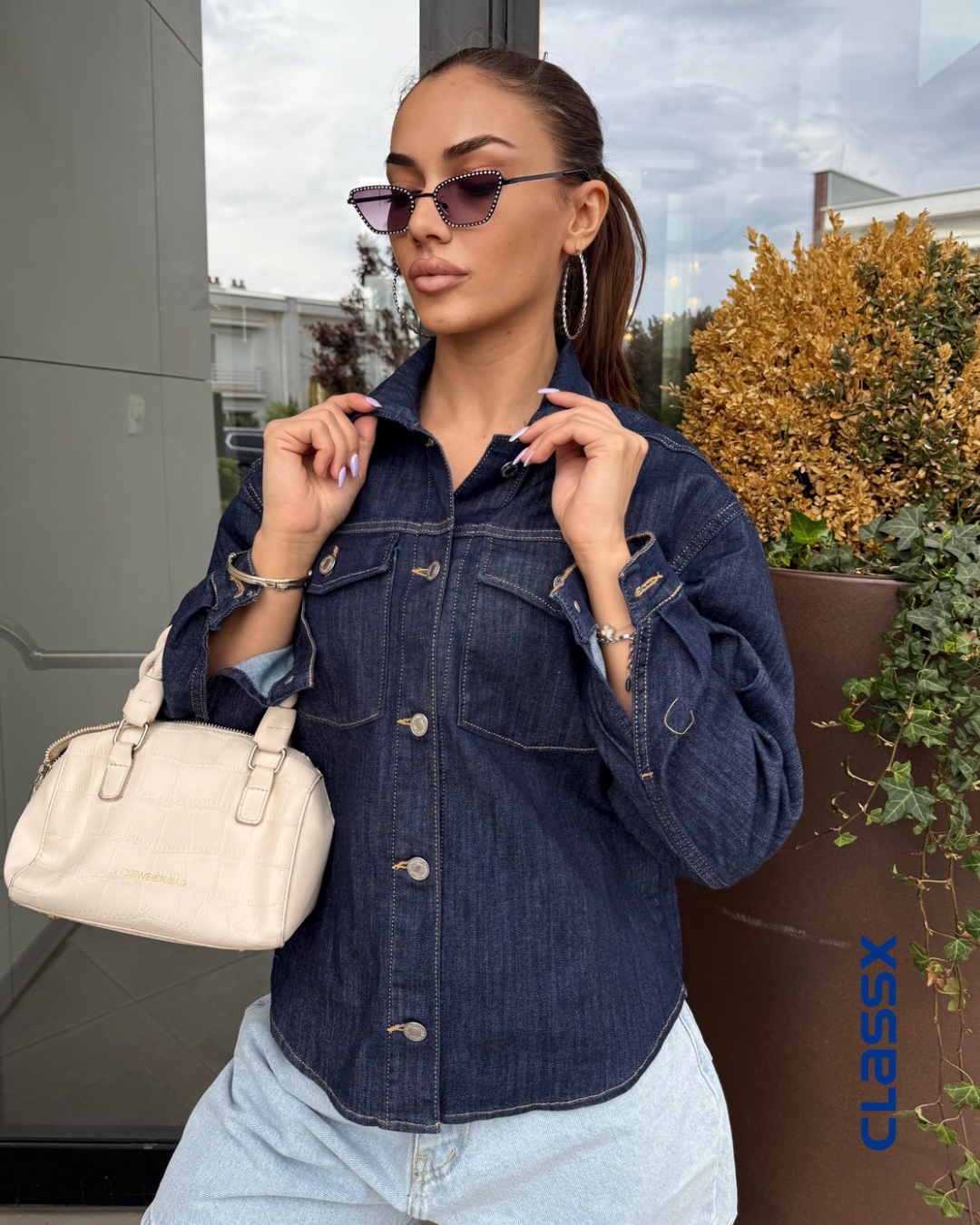 Denim košulja tamnog teksasa sa dugmadima, idealna za slojevito oblačenje i urban look. Klasičan kroj sa džepovima...