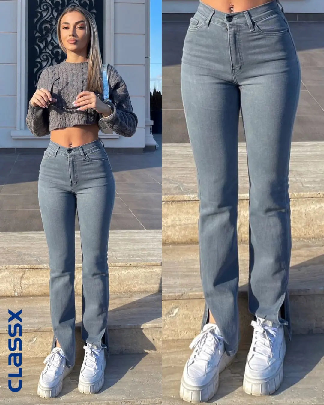 Farmerke dubokog struka sa ravnim nogavicama i prorezima